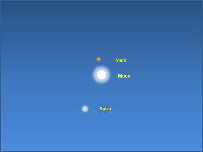 ولمشاهدة الاقتران، أنظر في اتجاه الجنوب الشرقي، في حوالي الساعة 7:30 مساءً. وسوف يظهر المريخ كنجم لامع، لونه محمر، يبعد نحو خمس درجات أعلى القمر (ملحوظة: يبلغ القطر الظاهري للقمر نصف درجة). وسيكون القمر والمريخ بين نجوم كوكبة العذراء البرجية، التي ألمع نجومها نجم السنبلة.