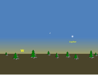 رسم توضيحي يُبَيِّن موقعي الهلال وكوكب المشتري في سماء الإسكندرية، مساء يوم 29 يونية 2014م، عقب غروب الشمس.