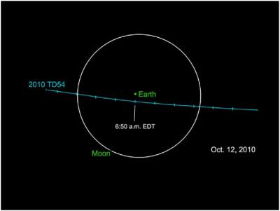 في يوم 12 أكتوبر 2010، يقترب الكويكب المعروف اصطلاحًا باسم 2010 TD54 من كوكب الأرض، ويمر على مسافة 45 ألف كم تقريبًا من الأرض، وهذه المسافة أقل من سبع متوسط بعد القمر.