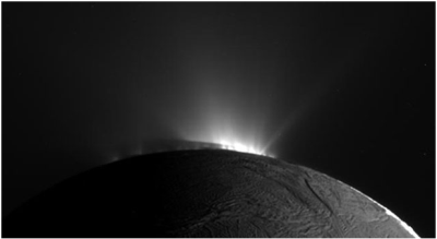 تبين الصورة سحب من بخار الماء وجسيمات جليدية، تندفع في الفضاء من فوالق في المنطقة القطبية الجنوبية لإنسيلادوس