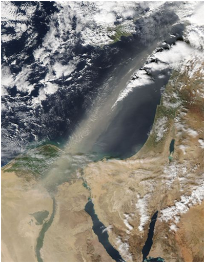 تبين الصورة، التي التقطها القمر الصناعي الأمريكي أكوا، التابع لوكالة الفضاء والطيران الأمريكية ناسا، عاصفة ترابية تمر في شمال مصر، و تمتد إلى البحر الأبيض المتوسط
