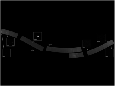 تبين هذه الصورة النظام الشمسي كما يبدو لجهاز التصوير الدقيق، على متن السفينة الفضائية الأمريكية ميسنجر، المتجهة إلى كوكب عطارد، أصغر الكواكب وأقربها إلى الشمس. تم إنتاج هذه الصورة عن طريق دمج 34 صورة التقطتها ميسنجر في نوفمبر 2010. يظهر في الصورة ستة من الكواكب هي، من اليسار إلى اليمين، الزهرة، الأرض، المشتري، المريخ، عطارد وزحل.