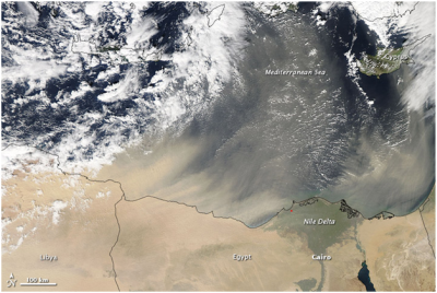 تبين الصورة، التي التقطها القمر الصناعي أكوا، التابع لوكالة الفضاء الأمريكية ناسا، في 19 فبراير 2011، عاصفة ترابية، تهب من ساحل شمال أفريقيا، إلى البحر المتوسط. تبين حدود الدول على الخريطة بخطوط سوداء.