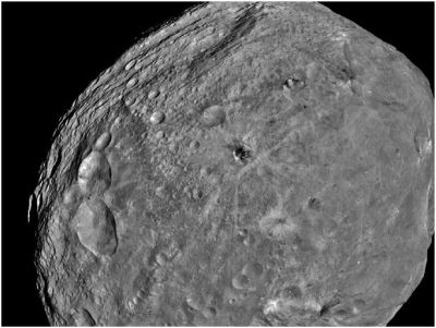 صورة مقربة للكويكب الغامض والعجيب فيستا، تم التقاطها حديثًا بواسطة السفينة الفضائية الأمريكية دون، التي تدرس هذا الكويكب حاليًا عن قرب، من مدار حوله. تبين الصورة التضاريس الوعرة على سطح فيستا، وأبرزها الفوهات النيزكية، التي نتجت من سقوط النيازك على فيستا. بلغ بعد الكويكب فيستا عن الأرض حوالي 180 مليون كم، وقت التقاط الصورة، وكانت دون على مسافة 5200 كم تقريبًا من فيستا.