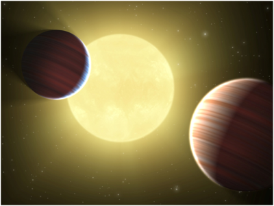 رسم توضيحي يبين كوكبين يمران أمام نجم مشابه للشمس، يعرف اصطلاحًا باسم "كبلر-9"