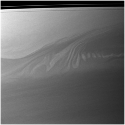 نشرت وكالة الفضاء الأمريكية "ناسا" حديثًا صورة مقربة لكوكب زحل، تبين أنماطًا من سحاب جميل ومضطرب، تطفو في الغلاف الجوي لزحل. تم التقاط الصورة في يوم 18 يوليو 2010، من مدار حول زحل، بواسطة السفينة الفضائية كاسيني، التي كانت على بعد حوالي 2.4 مليون كم من زحل.