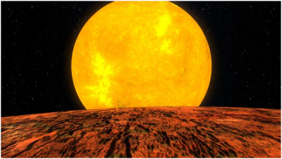 رسم توضيحي يبين النجم كبلر-10، المشابه للشمس، يشرق فوق أفق كوكب تابع له، اكتشف حديثًا بواسطة السفينة الفضائية الأمريكية كبلر.