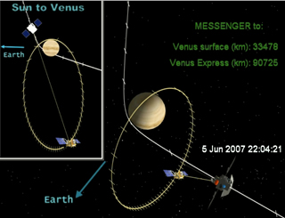 On 5 June 2007, NASA’s Mercury-bound MESSENGER spacecraft made its second flyby Venus, our nearest planet, for a gravity assist. This maneuver reduced the size of MESSENGER's orbit around the Sun, pulling it closer to Mercury. The spacecraft's velocity changed by nearly 24,000 km/hr.