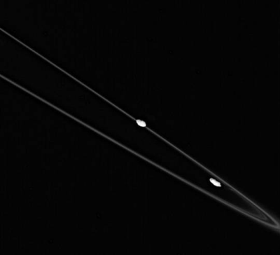 A Cassini spacecraft image of the F ring, Prometheus and Pandora