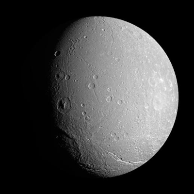 The sharpness of the image enables scientists to study the craters of Dione (1,126 km across). The number of craters provides valuable information about the geologic evolution of a planetary surface. Densely craters regions are believed to be old surfaces, while areas with fewer numbers of craters are likely to be young or geologically active.