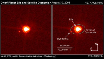 Dr. Mike Brown (Caltech) and colleagues report in a recent issue of Science Magazine that Dysnomia orbits Eris every 16 days in a nearly circular orbit. These results support the postulate that Dysnomia originated in a massive collision between Eris and another Kuiper Belt Object (KBO), not a captured moon. The orbit of a gravitationally captured moon tends to be elliptical in shape.