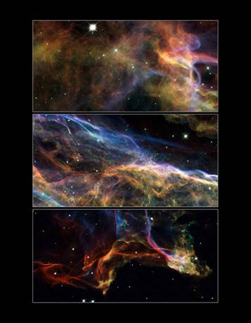 NASA's Hubble Space Telescope (HST) imaged three portions of the Veil Nebula, the shattered remains of a massive star that exploded thousands of years ago. This series of images provides superbly detailed views of the delicate, wispy structure resulting from this cosmic explosion. The Veil Nebula is one of the most spectacular supernova (exploding star) remnants in the sky. The entire cloud spans about 3° on the sky, corresponding to about 6 full-moon breadths.