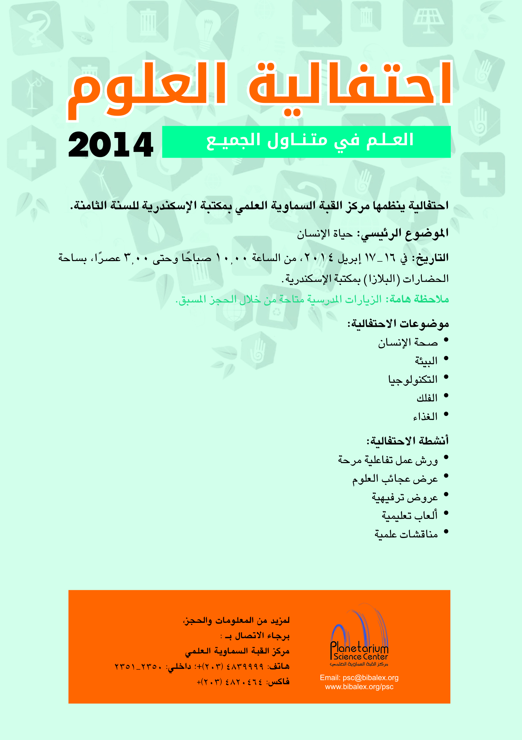 The Science Festivity is a successful event that takes place all around the world where schools, universities, associations, and institutions organize events revolving around Science. The Bibliotheca Alexandrina (BA) Planetarium Science Center (PSC) has successfully organized the Science Festivity for seven consecutive years, which include science villages, lectures, live shows like, The Super Science Show, The Black theater; operated by the BA Arts Center, and other Entertainment shows, in addition to movies, Science Café and visits to the BA.