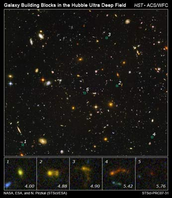 This indicates that they may be undergoing interactions and mergers with nearby companion galaxies to form larger structures. The galaxies were observed in an intriguing long-exposure image, the Hubble Ultra Deep Field (HUDF), with Hubble's Advanced Camera for Surveys and the Near Infrared Camera and Multi-Object Spectrometer. Observations were also carried out with SST's Infrared Array Camera and the European Southern Observatory's Infrared Spectrometer and Array Camera.