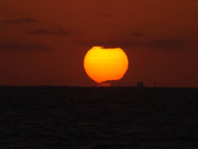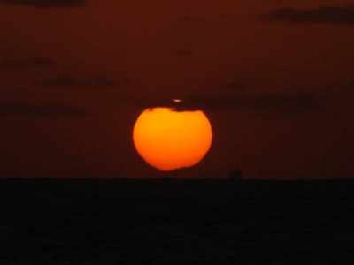 The distorted image of the Sun is sinking. A passing ship is seen in silhouette.