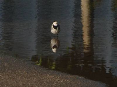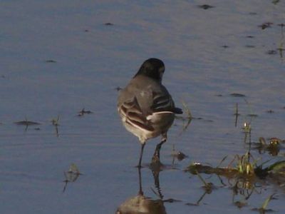 The white wagtail is approximately 15-20 cm long, and characterized by a long tail. It shows a black and white pattern with a gray back. The white wagtail frequently wags its tail up and down when it lands. It is an insectivorous bird and may also eat worms. It is found in cities, farms and near water.