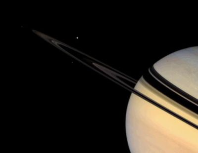 Saturn’s rings shine feebly in scattered sunlight. Tethys (1,071 km across), the largest moon in the view, is on the far side of the ringplane. Mimas (397 km across), is the one on the near side of the rings, below Tethys. Janus (181 km across), is left of the rings' edge. Tiny Pandora (84 km across) is a speck below the rings' edge, between Janus and Mimas. Mimas’ shadow is visible as a pale dark dot on Saturn's bluish northern hemisphere.