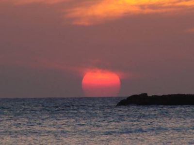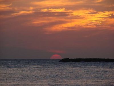 The photo shows the flattening and distortion of the Sun disc that occur due to optical atmospheric effect. The Sun disc is rather oval in shape, due to refraction of sunlight through the thicker atmospheric layers near the horizon. The lower portion of the Sun disc is dimmer and of a darker hue, also due to refraction effects.