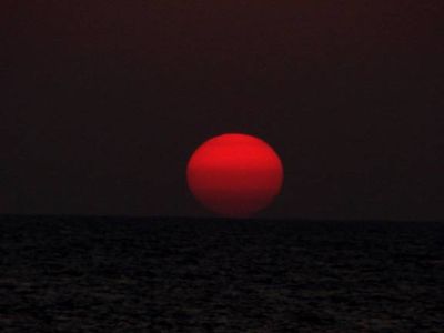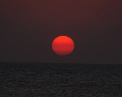 The photo shows the sunset mirage. The upper limb of a feeble Sun rises from the sea, merging with the setting Sun.