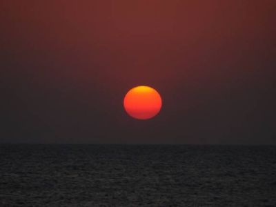 The picture shows a fascinating sunset over Alexandria, Egypt. Due to optical atmospheric effects, the Sun disc is reddened and flattened. The solar limb is also not smooth. The presence of thin clouds across the horizon rendered the Sun a banded appearance. Actually, the Sun resembles Saturn, the most flattened planet, when its magnificent rings lie in the plane of Earth’s orbit and become visible edge-on.
