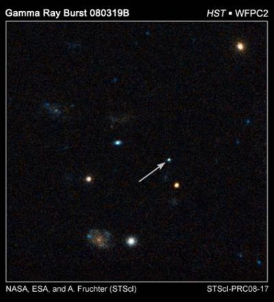 Such explosions are also known as "hypernovae," as they are more powerful than ordinary supernova explosions and are far more luminous. Their energy rather seems to be concentrated into a blowtorch-like beam that, in this case, was aimed directly at Earth. The Hubble image also shows field galaxies around the object, which are probably unrelated to the burst itself.