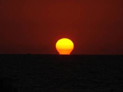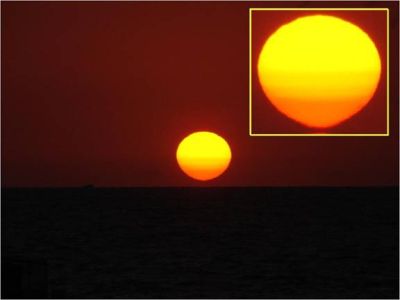 The photo shows the flattening and distortion of the Sun disc near the horizon, due to optical atmospheric effects. During sunset, the sun disc may take on fantastic shapes, such as a peach, a balloon or a bulb.