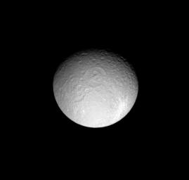 The image was taken in visible light with the Cassini spacecraft narrow-angle camera on 13 May 2008. The view was acquired at a distance of approximately 889,000 km from Rhea. Image scale is 5 km per pixel.
