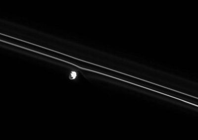 A spectacular image showing Prometheus (right) and Pandora (left), the shepherd moons of Saturn’s active F ring