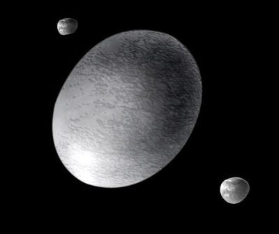 Hawaiian mythology says that the goddess Haumea's children sprang from different parts of her body. The dwarf planet Haumea has a similar history, as it is orbited by two moons that are thought to have been created by ancient impacts with Haumea. During these impacts, parts of Haumea's icy surface were blasted off. The two moons are believed to have formed from the debris from these impacts.