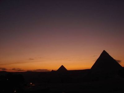 The photo shows a purple twilight over two of Giza’s mighty Pyramids, the Pyramid of King Khephren (right) and the Pyramid of King Mycrinus (left).