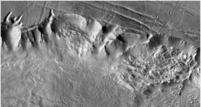 This image shows a 90-mile-wide portion of the giant Valles Marineris canyon system. Landslide debris and gullies in the canyon walls on Mars are shown at 100 meters per pixel.