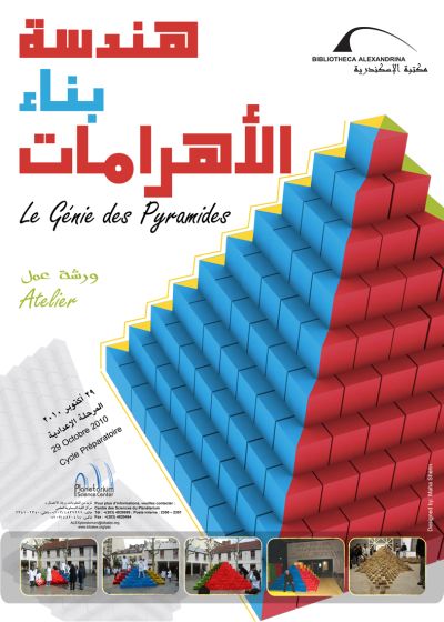 The Planetarium Science Center is organizing an event entitled “Le Genie des Pyramides” (Pyramids Building Techniques) on Friday, 29 October 2010, presented by Pierre Crozat, the French architect, that aims to explain different theories of pyramids construction with different materials.The idea is based on building a model of a pyramid on an area of 3.5 m × 3.5 m, using one of the theories that was used at the age of the pharaohsThe event targets preparatory school students. It will take place from 14:00 till 16:00.