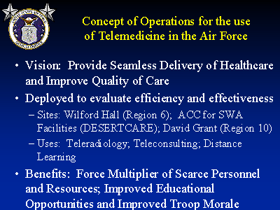Telemedicine deployed extensively in Region 6 as a test site (Wilford Hall, 4 Army MTFs and 1 Navy)