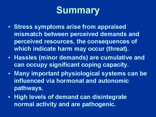 a mismatch between perceived demands and perceived resources. Hassles (minor demands) are cumulative and can present a