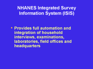 Integrated Survey Information System or ISIS. This central computer system… (read slide) We use it to Manage the flow of individuals through the trailers. It allows for near real-time looks at the data for QC purposes. It is used to generate reports of findings that go out to participants. |