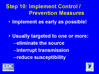 Eliminate the source – chlorinate water supply, eliminate standing water (mosquito breeding sites) Interrupt mode of transmission – spray for mosquitoes (adulticide), bed nets Reduce susceptibility – vaccinate; give post-exposure prophylaxis for rabies, hepatitis A, etc.; DEET and/or long sleeves and pants to reduce bites |