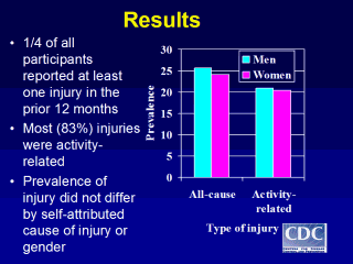 | One-quarter of all participants reported at least one injury in the previous 12 months. Men had a higher prevalence of both all-cause and activity-related injuries than women. Activity-related injuries accounted for most (83%) of the all-cause injuries. |