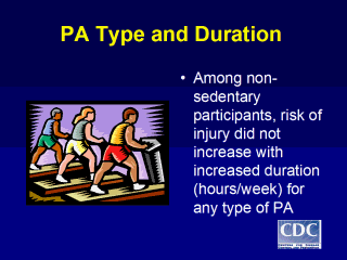 | In a subanalysis of active participants (excluding sedentary), injury risk did not increase with increasing hours of activity per week even after adjusting for type of activity, fitness level, age, gender, previous injury, weight training, BMI and flexibility exercises. |
