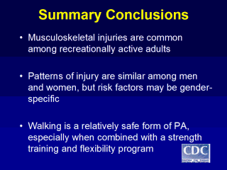 recreationally active adults will suffer an injury. Patterns and the prevalence of injury are similar among men and women, but actual risk factors may be gender-specific. Walking, and other moderate types and amounts of activity, seem to be a relatively safe form of physical activity, especially when combined with a strength and flexibility program. |