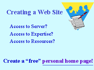 In deciding to create a web site you must take into account your access to a server, access to technical expertise to create the html files, and access to resources to update and maintain your site. |