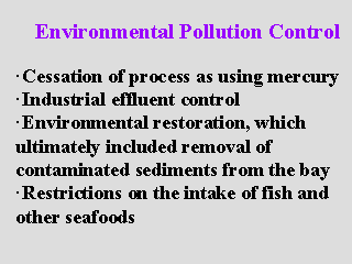floor, and monitoring of methylmercury levels in fish and wastewater. With regard to the Minamata plant of Chisso Co. Ltd., through the completion of total circulation system, industrial water effluent containing methylmercury compounds had not been discharged outside of the plant since 1966, and the pollution source itself was eliminated through cessation of the production of acetaldehyde in 1968. In the Agano River basin area, the production of acetaldehyde was discontinued before the discovery of Minamata disease. As a result, the wide-ranging environmental protection policies and measures that we have today come to be developed. |
