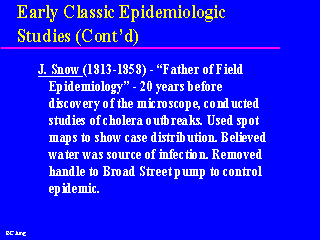 | A truly classic epidemiologic study. You can find an excellent write up of Snows work in Chapter 2 of Edward R. Tuftes Visual Explanations, entitled: "Visual and Statistical Thinking: Displays of Evidence for Making Decisions." |