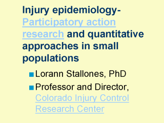 Dr. Stallones is a Professor and the Director of the Colorado Injury Control Research Center, a Centers for Disease Control and Prevention, National Center for Injury Prevention and Control funded academic research center. Her interest in research issues among rural populations and under-served communities began with research conducted among farm families and a stint in the Peace Corps in Micronesia.