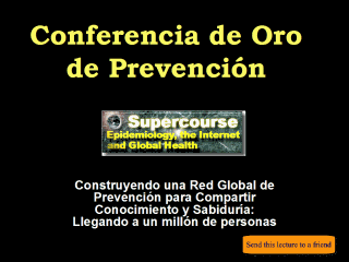 prevención vale una libra de curación" Henry De Bracton, 1240 El valor de la prevención primaria era conocido por la humanidad por muchos siglos. Desafortunadamente, aún hoy sus beneficios no son siempre reconocidos debido a la obsesión por la alta tecnología en la medicina moderna. Nosotros, en el proyecto Supercourse ( www.pitt.edu/~super1), decidimos darle la importancia a la prevención con el desarrollo de la "Conferencia de Oro de la Prevención".El Supercurso, esta financiado por la National Library of Medicine, NIH, es una biblioteca de conferencias basada en Internet sobre prevención y salud pública, compartidas gratuitamente por los 10,000 miembros de 151 países en la Red de Salud Global (Global Health Network). Nosotros hemos desarrollado una Conferencia de Oro de la Prevención para ilustrar y conmemorar el rol de la prevención para continuar haciendo nuestro planeta más saludable. Nota: Envía esta presentación a algún amigo. El botón funciona desde la opción de show de diapositiva de PowerPoint This lecture was created by Faina Linkov, MPH with the help of Supercourse group in Pittsburgh, PA and the Global Health Network Traducción al español hecha por: Beatriz Rico Verdín MD, MSc, PhD Candidate, Dr.Efraim Meneses and Dr. Orlando Barrionuevo. |