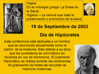de Hipócrates Hipócrates, (460-377? AC), un extraordinario médico escritor de Grecia. Poco se sabe de su vida más allá del hecho de que era un médico en la Isla de Cos, que perteneció al período más intelectual de la vida Griega, y que Hipócrates era particularmente libre de superstición. Más de ochenta tratados han sido atribuidos a él, pero ahora se concede que algunos fueron escritos por otros que tomaron prestados su nombre y reputación. Sus obras, tomadas en conjunto, forman diez volúmenes, una enciclopedia de medicina y cirugía como se conocía en sus días. Hipócrates ha sido llamado el padre de la medicina científica. Él no creía en enfermedades ni curas milagrosas. El pensaba que una dieta apropiada es una necesidad de la salud, y que el clima tiene una profunda influencia tanto en la mente como en el cuerpo. Murió en Tesalia a una edad avanzada. http://www.sacklunch.net/biography/H/Hippocrates.html El 19 de Septiembre se celebra el Día de Hipócrates en Grecia. Nosotros sugerimos que el Día de Hipócrates sea celebrado a lo ancho del mundo como celebración de la prevención, un "Día Mundial de la Prevención" en el que podamos trabajar juntos para prevenir la enfermedad. El 19 de Septiembre de 2003 nos gustaría "casar" los conceptos médicos de Hipócrates y los conceptos preventivos de la Diosa griega de la Salud, Higeia. HIGEIA era la deidad de la buena salud y una asistente de su padre Asclepios y también de Afrodita quien vino a representar la prevención de la enfermedad. La "unión" de Hipócrates e Higeia puede también representar dos formas de energía, Yan & Yin. Para información adicional sobre Hipócrates, visita http://www.allsands.com/Science/hippocratesbiog_rtb_gn.htm Esta diapositiva fue creada por el equipo de Global Health Network Supercourse |