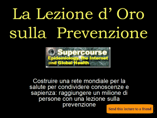 Il valore della prevenzione primaria è noto all’Uomo da molti secoli. Purtroppo i vantaggi della prevenzione sono talvolta sottovalutati per l’attenzione che viene posta alla medicina attuale ad alta tecnologia. Noi, al progetto Supercourse ( www.pitt.edu/~super1), abbiamo scelto la prevenzione e abbiamo deciso di sviluppare la "Lezione d’Oro sulla Prevenzione.Supercourse, finanziato dalla National Library of Medicine, NIH, è una biblioteca di lezioni, basata su Internet, in materia di prevenzione e salute pubblica, condivise gratis dai 10.000 aderenti al Global Health Network, di 151 Paesi. Abbiamo sviluppato questa Lezione d'Oro sulla Prevenzione per illustrare e celebrare il ruolo della prevenzione nel continuo sforzo di render più sano il nostro pianeta. Nota: il bottone "send this lecture to a friend" funziona in Presentazione diapositive. Presentazione (PowerPoint) Questa lezione è stata creata da Faina Linkov, MPH, coll’aiuto del gruppo di Supercourse di Pittsburgh, PA, e del Global Health Network. The lecture was translated into Italian by Daniele Agostini and Pierpaolo Mastroiacovo. |