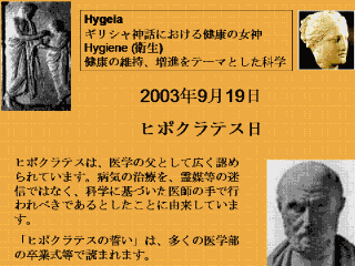 ギリシアでは、9月19日を、ヒポクラテス日として祝います。我々は、この9月19日は世界病気予防の日として、世界中で祝われるべきであると考えます。そして、2003年9月19日は、ヒポクラテスの医学の概念と、Hygeia