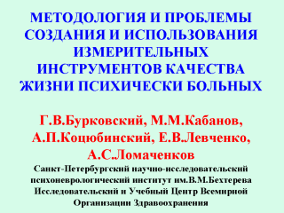 | Статья опубликована в сборнике «Психосоциальная реабилитация и качество жизни». Ред-ры А.С.Ломаченков и В.А. Михайлов, Сборник научных трудов Санкт-Петербургского научно-исследовательского психоневрологического института им. В.М. Бехтерева, посвященный 75-летию профессора М.М. Кабанова, том 137, СПб, 2001, стр. 80-94. |