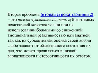 | Даже высокая эффективность реабилитации таких больных по иным объективным медицинским или жизненным показателям может слабо отражаться на субъективных показателях качества жизни, приводя к перераспределению реабилитационных ресурсов не в пользу этих пациентов. Видимо, и в этих случаях желательно иметь в субъективных показателях качества жизни встроенные дополнительные шкалы эмоциональной адекватности, которые позволят корректно интерпретировать результаты измерений. |