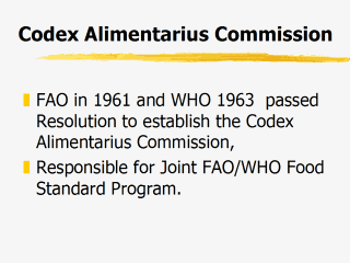 and health related issues, in the light of the international food standards. At the World Health Assembly, held in 1953, it was confirmed that the broad usage of chemicals in food production and processing imposed itself as a new public health problem that required special attention. On its 11th session, held in 1961, the conference of FAO decided to establish the Codex Alimentarius Commission. In 1962 the Joint Conference of FAO and WHO for food standards requested from the Codex Alimentarius Commission to implement their Joint FAO/WHO program for food standards and at the same time create the Codex Alimentarius. The World Health Assembly formally accepted the joint program of FAO/WHO for food standards, completely accepting the responsibility in relation with all food health aspects, on its 16th session, held in May 1963, and accepted the Statute of the Codex Alimentarius Commission. |